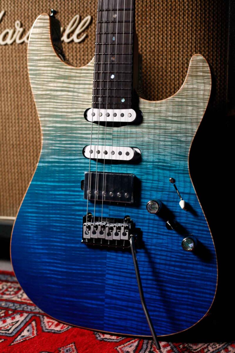 なんと美しいフレイムメイプルトップ&カラーリングでしょう。ボディバックはワイルドな木目の1ピース・ライトウェイトアッシュ材を使用、バックのカラーもフェードになっております。