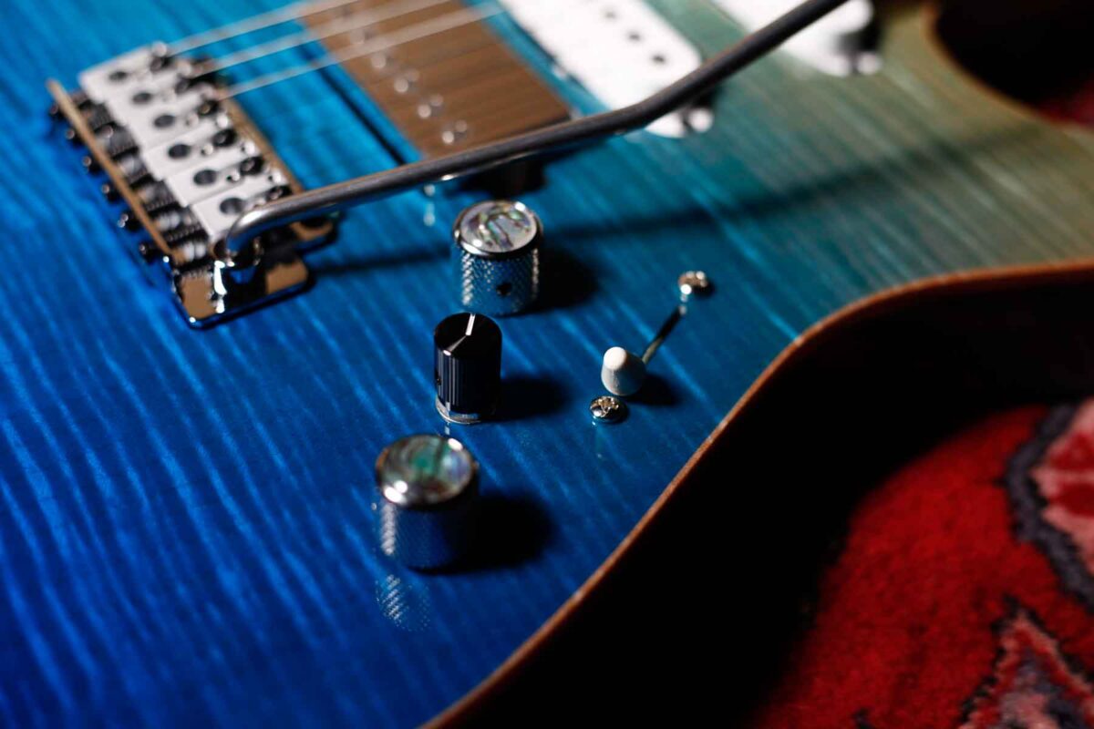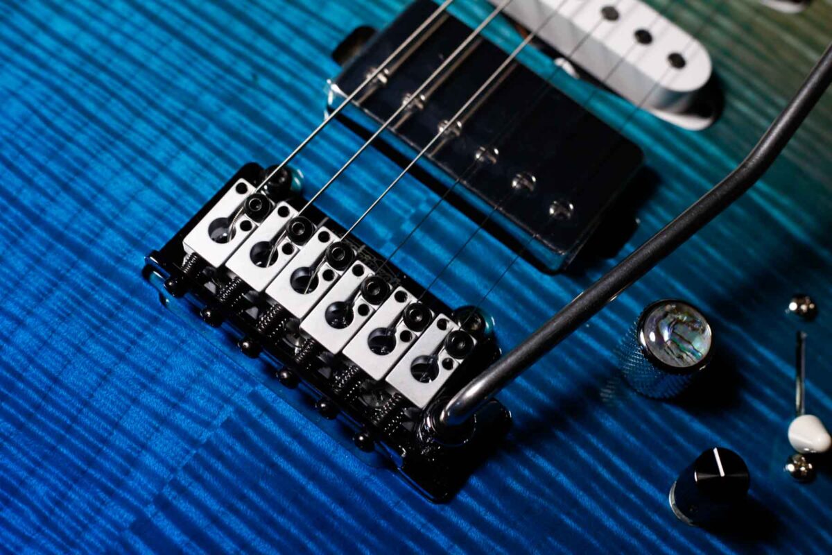 ブリッジはWilkinsonのロック式サドルの2点式ブリッジWVS130を採用。安定したチューニングと滑らかかつ大胆なアーミングを可能にします。写真では分かりづらいですがブリッジ周囲には落とし込み加工がしてあり、水平なセッティングに保ちながらもアームアップを可能にしました。