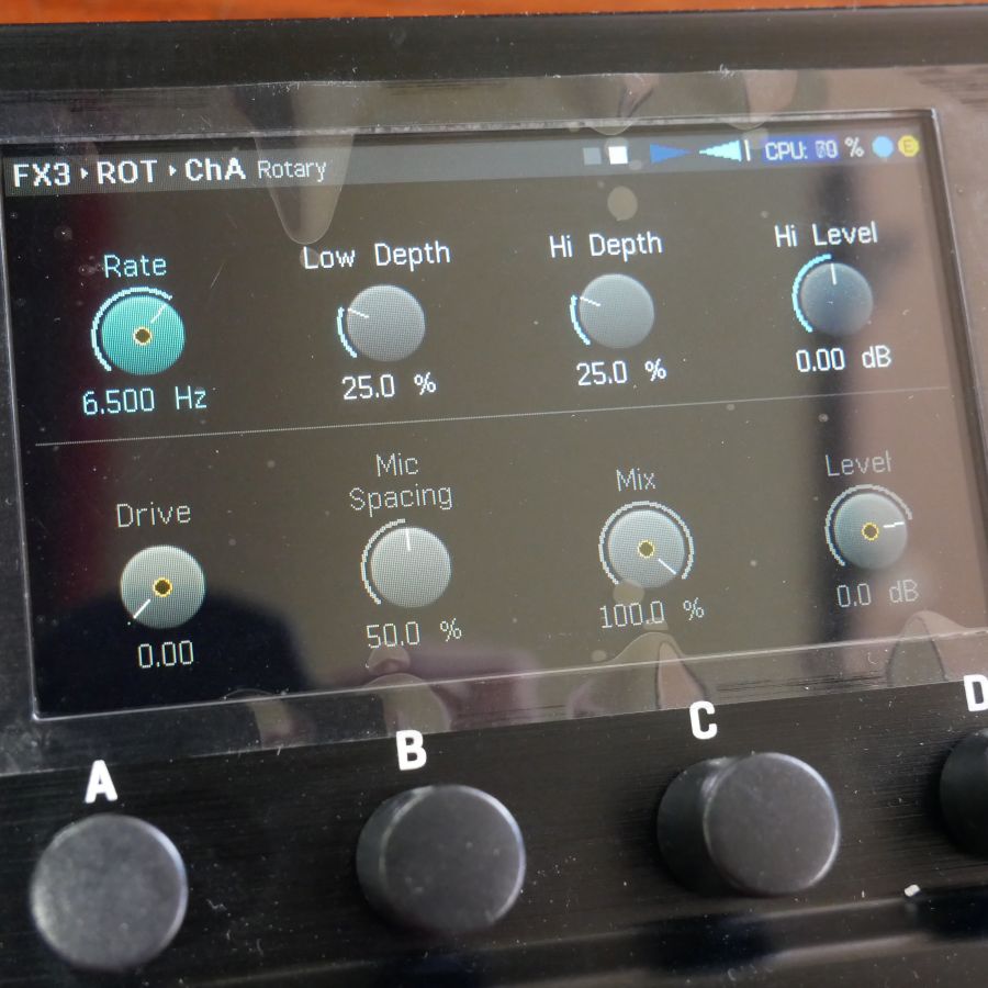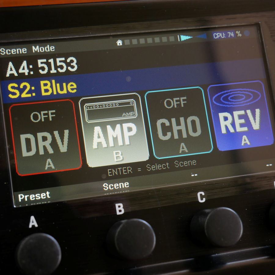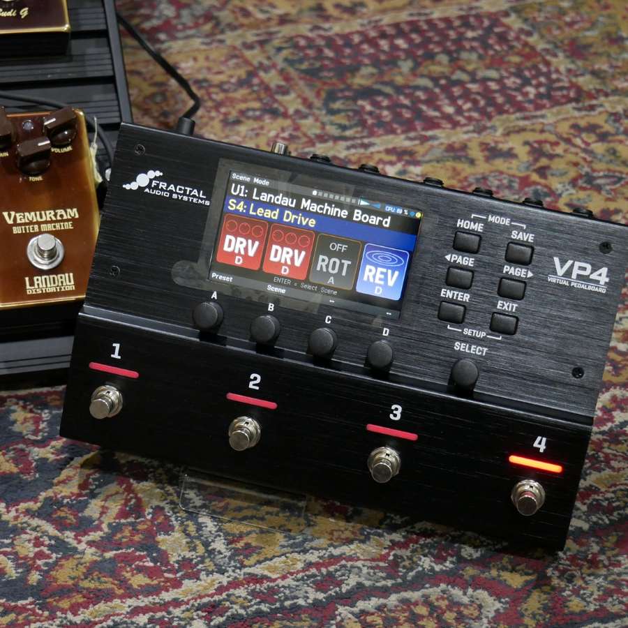 VP4にはプリセット内で設定を4つ保存できるシーンモードがありますので、ドライブサウンド(シーン3とシーン4)では、ペダルのチョイスはそのままにドライブのゲインアップとリバーブをちょっと深めにしております。