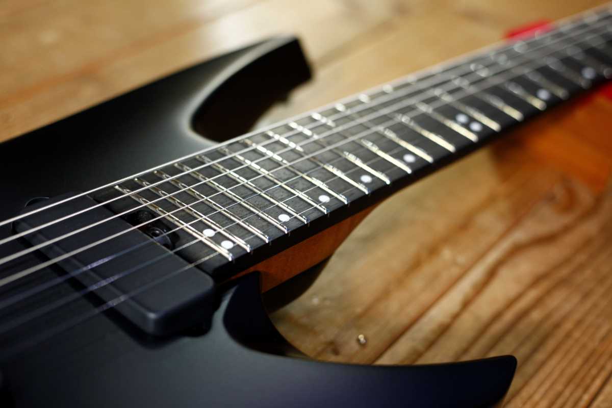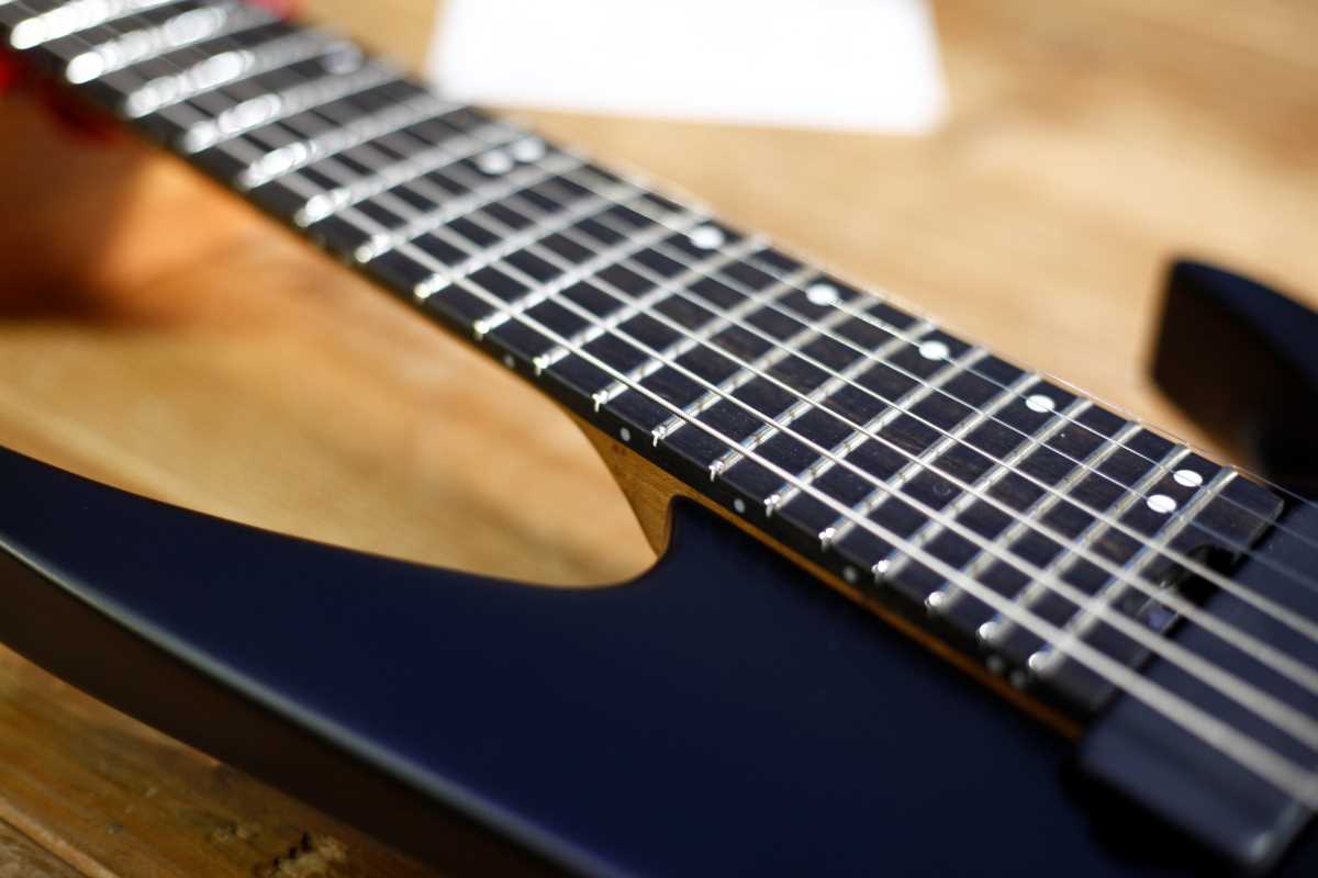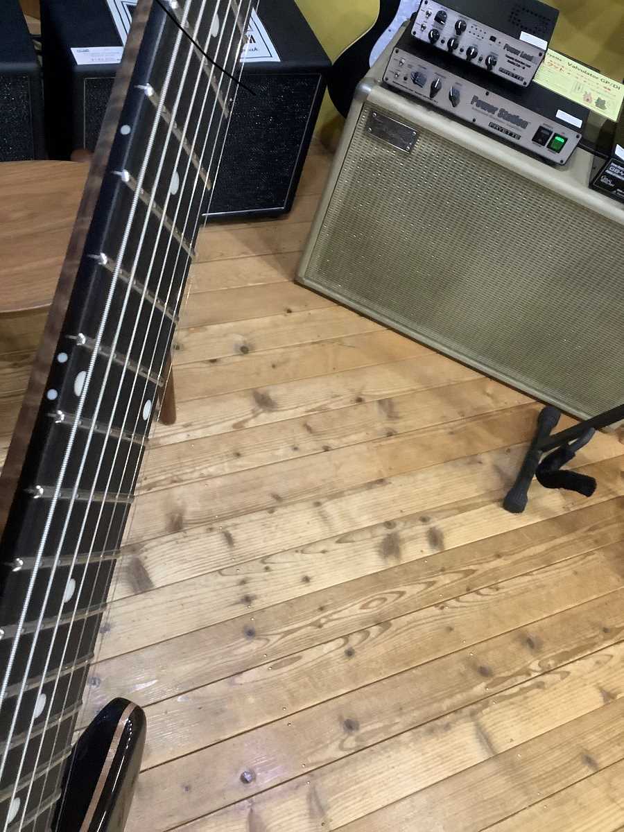 フレットを下を見て頂けるとよくわかるのですが、1弦側と7弦側で指板であるエボニーの厚さが違います。