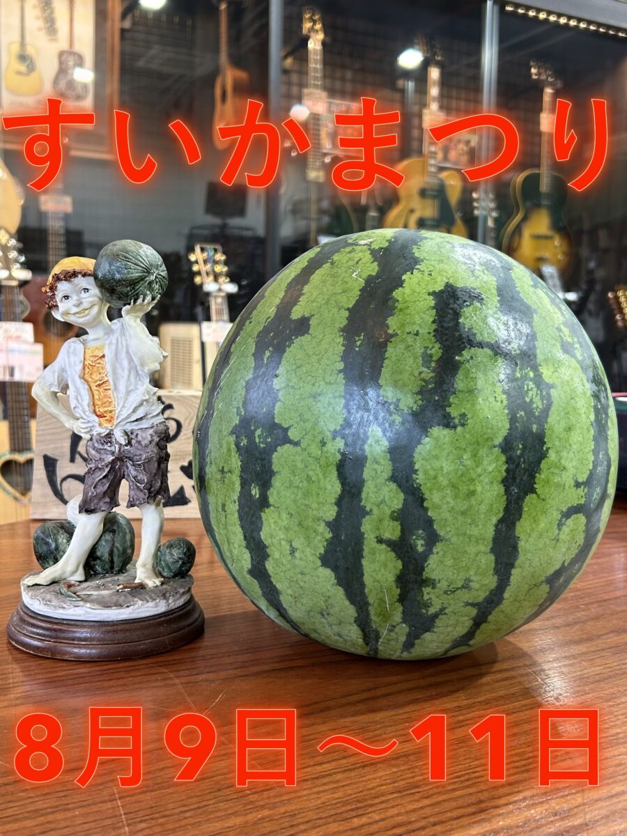 ※8月9日~11日はすいかまつりを開催しております。クーラーの効いた店内で、ギター工場より直送の美味しいすいかを食べて、【涼】を感じながら、Flying Vを見て、弾いて、アツくなるというのもまた良いのではないでしょうか?