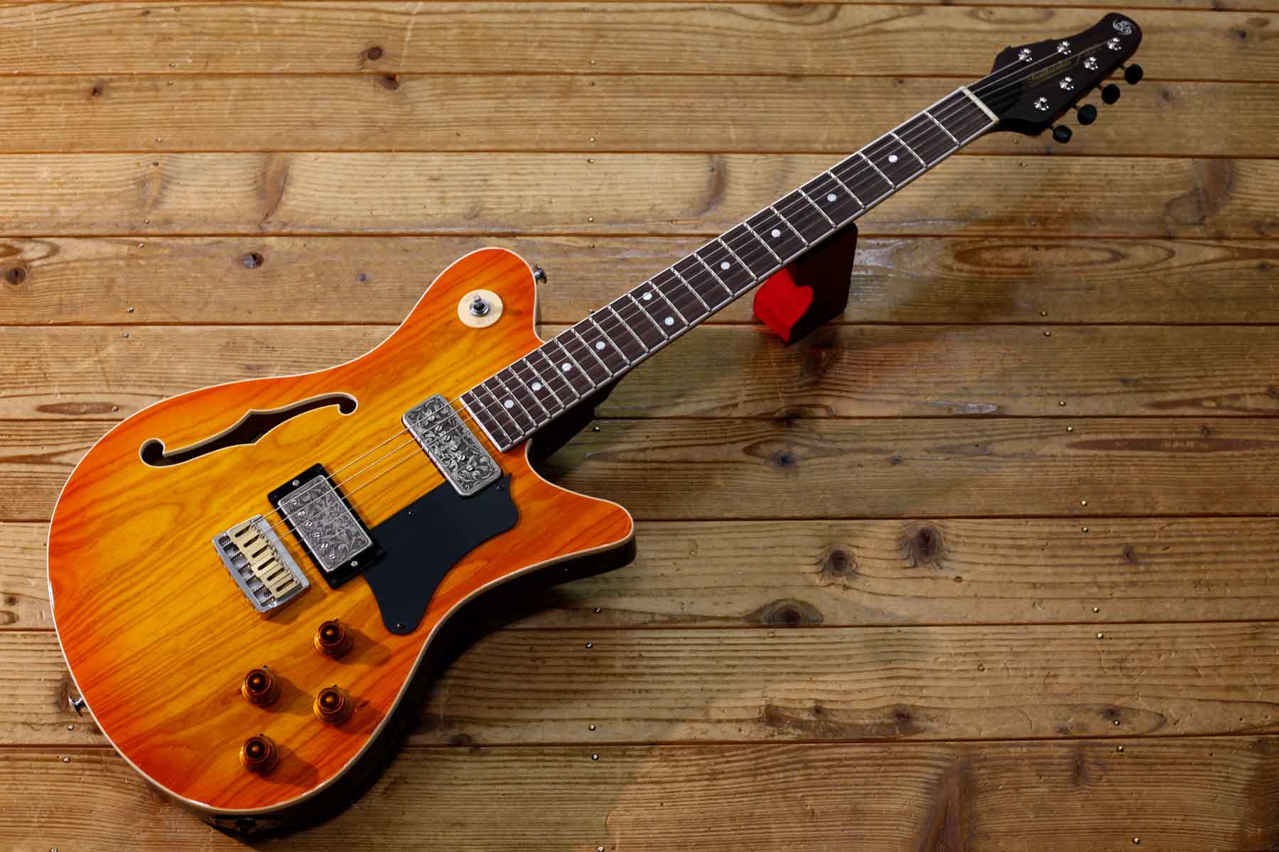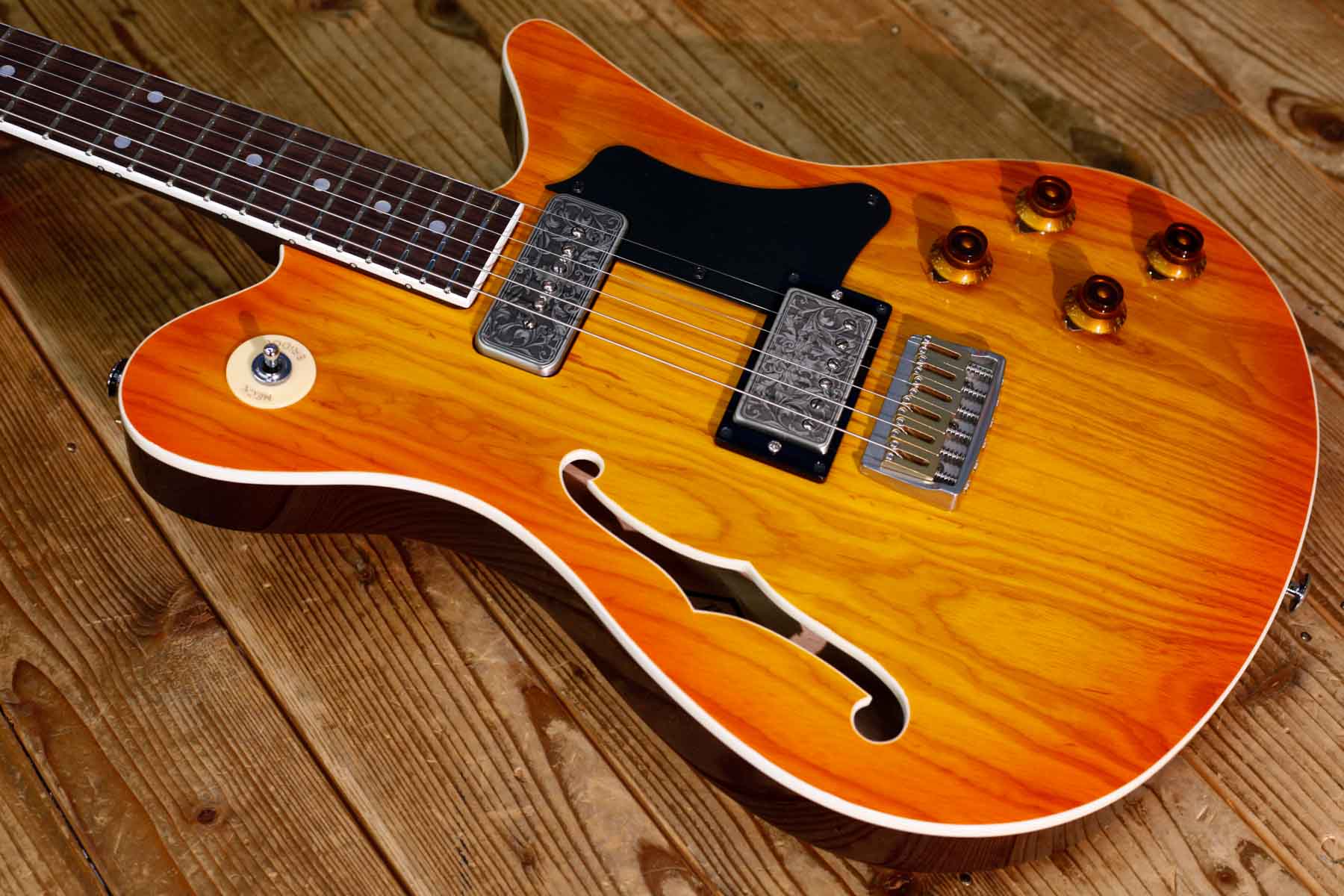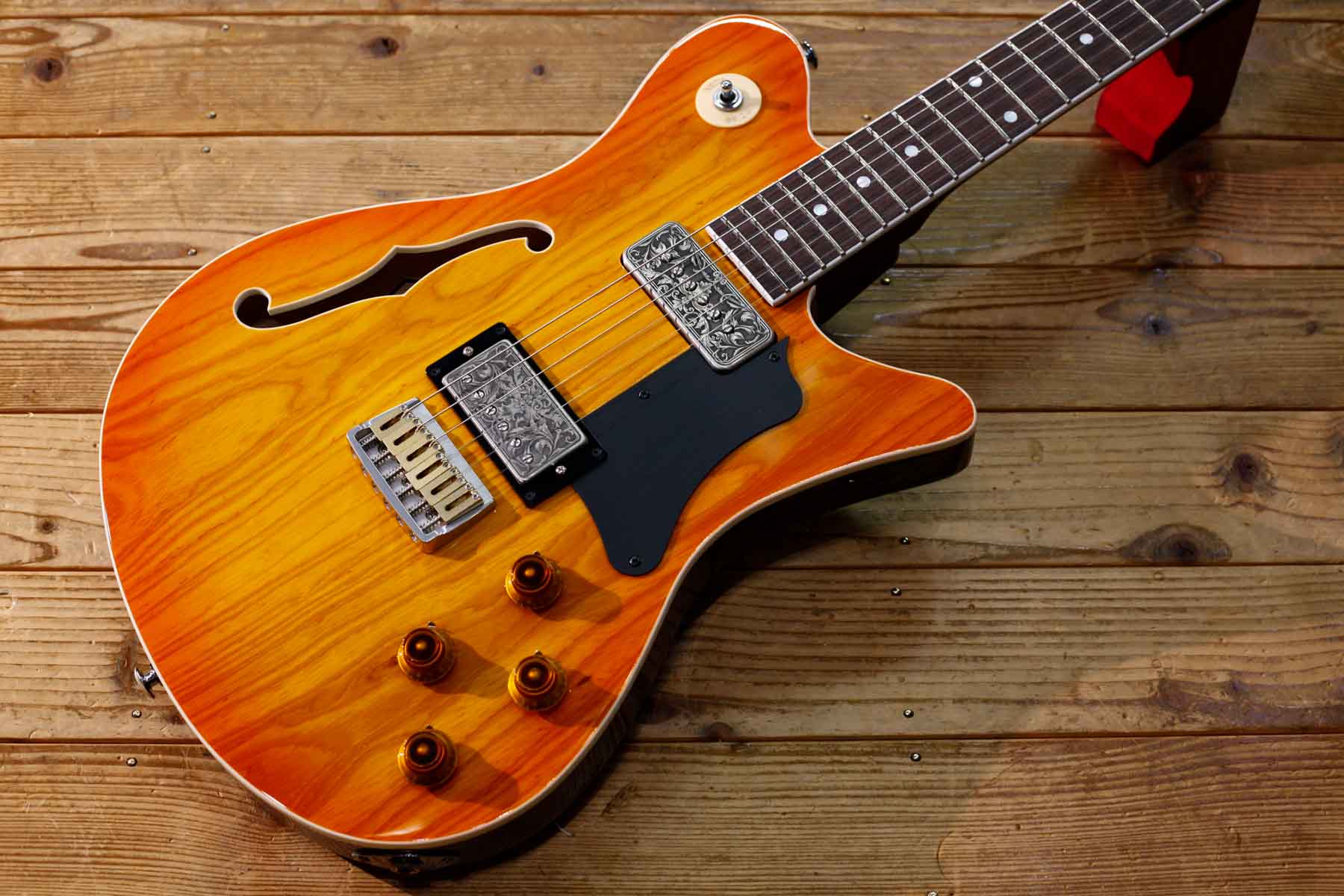 トップ材には美しい杢目が印象的なアッシュを、バックにはアルダーを採用。セミホロウ構造による空気感のある鳴りに、アッシュの明瞭さとアルダーのバランスの良さが加わり、立ち上がりが良く、倍音豊かで抜けの良いトーンを生み出します。さらに、ラッカー仕上げによるナチュラルな響きが、木材本来の美しさと音響特性を存分に引き出しています。