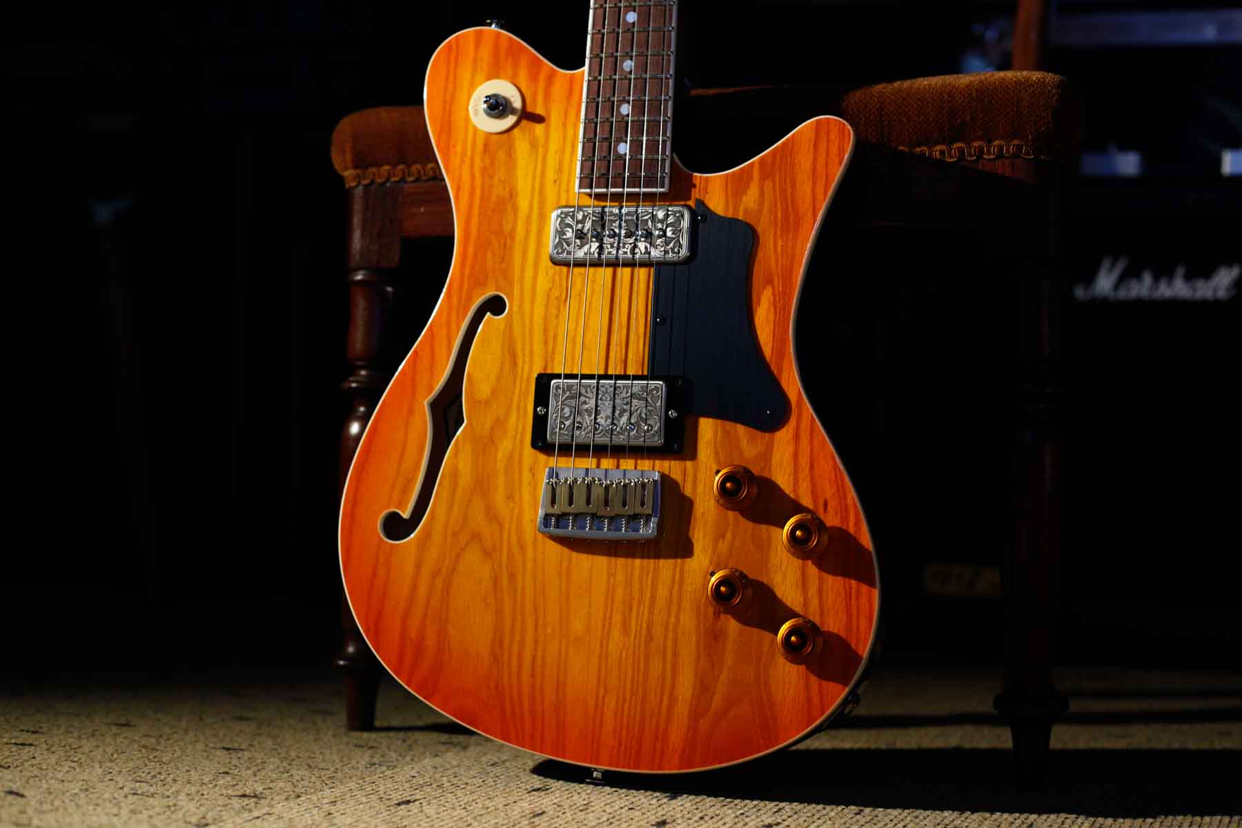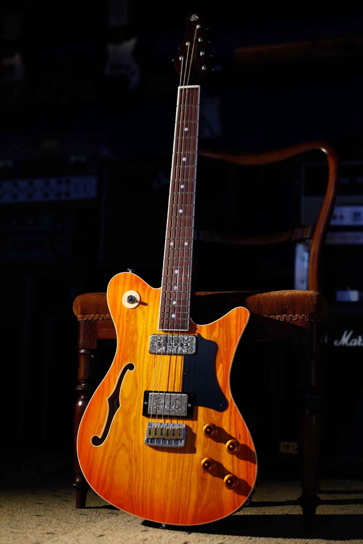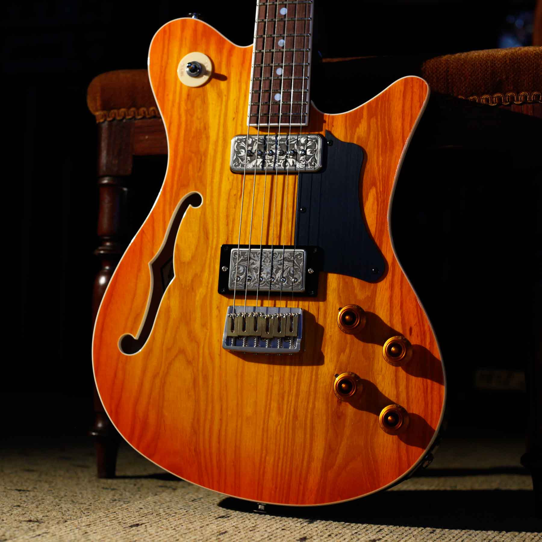 トップ材には美しい杢目が印象的なアッシュを、バックにはアルダーを採用。セミホロウ構造による空気感のある鳴りに、アッシュの明瞭さとアルダーのバランスの良さが加わり、立ち上がりが良く、倍音豊かで抜けの良いトーンを生み出します。さらに、ラッカー仕上げによるナチュラルな響きが、木材本来の美しさと音響特性を存分に引き出しています。