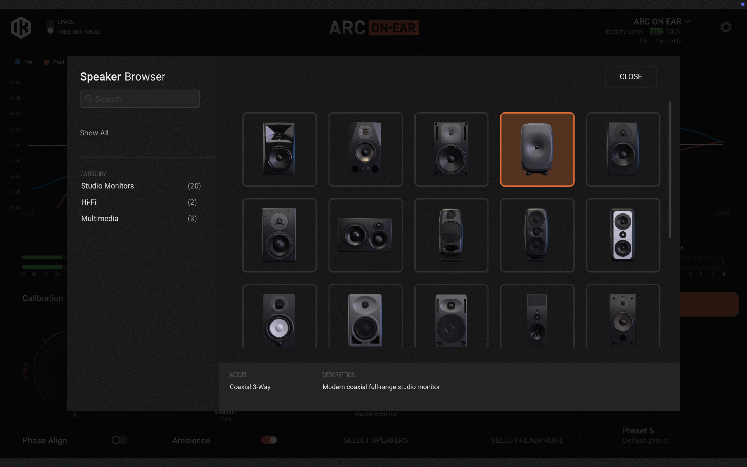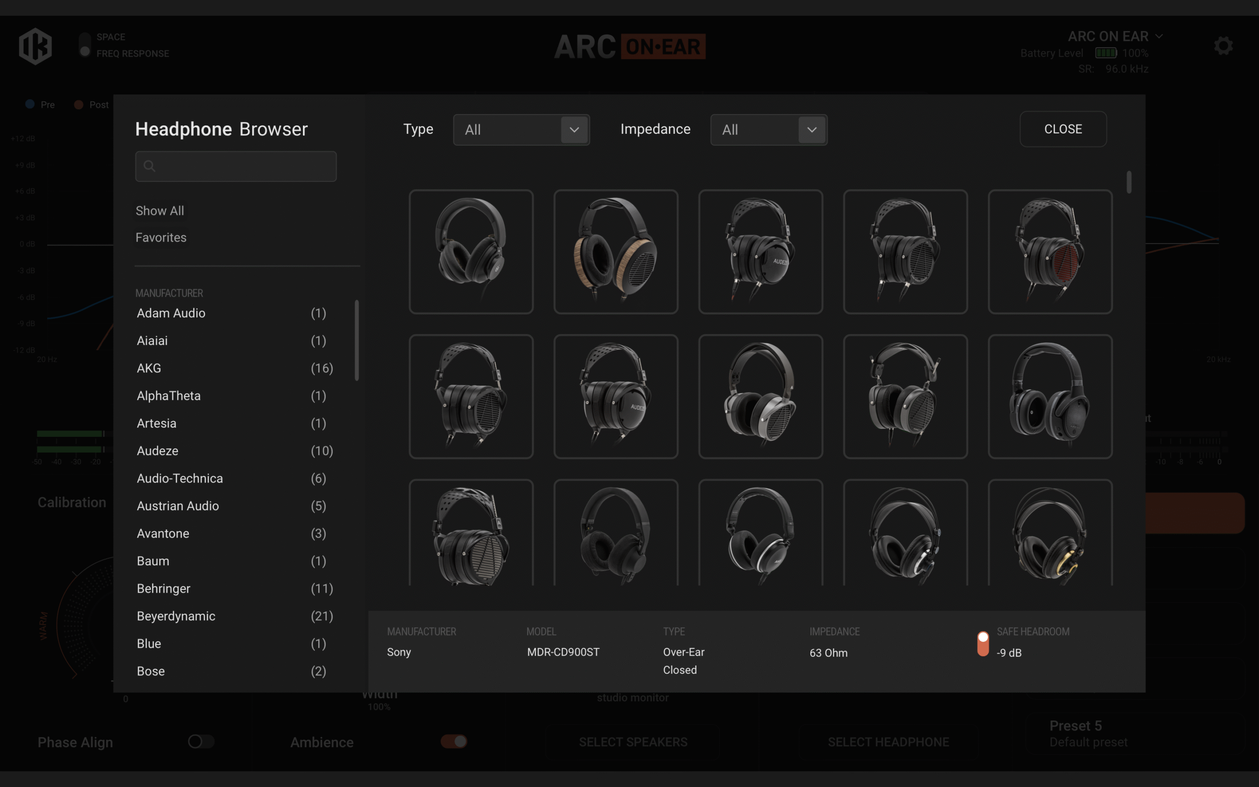 ソフトウェアライブラリの中には数百種類のヘッドフォンが登録されています。お使いのヘッドフォンを選択することでその特性を確認でき、キャリブレーション機能をONにするとフラットの状態に補正してくれます。対応ヘッドフォンモデル一覧はこちらから(https://www.ikmultimedia.com/products/arconear/?p=headphones)