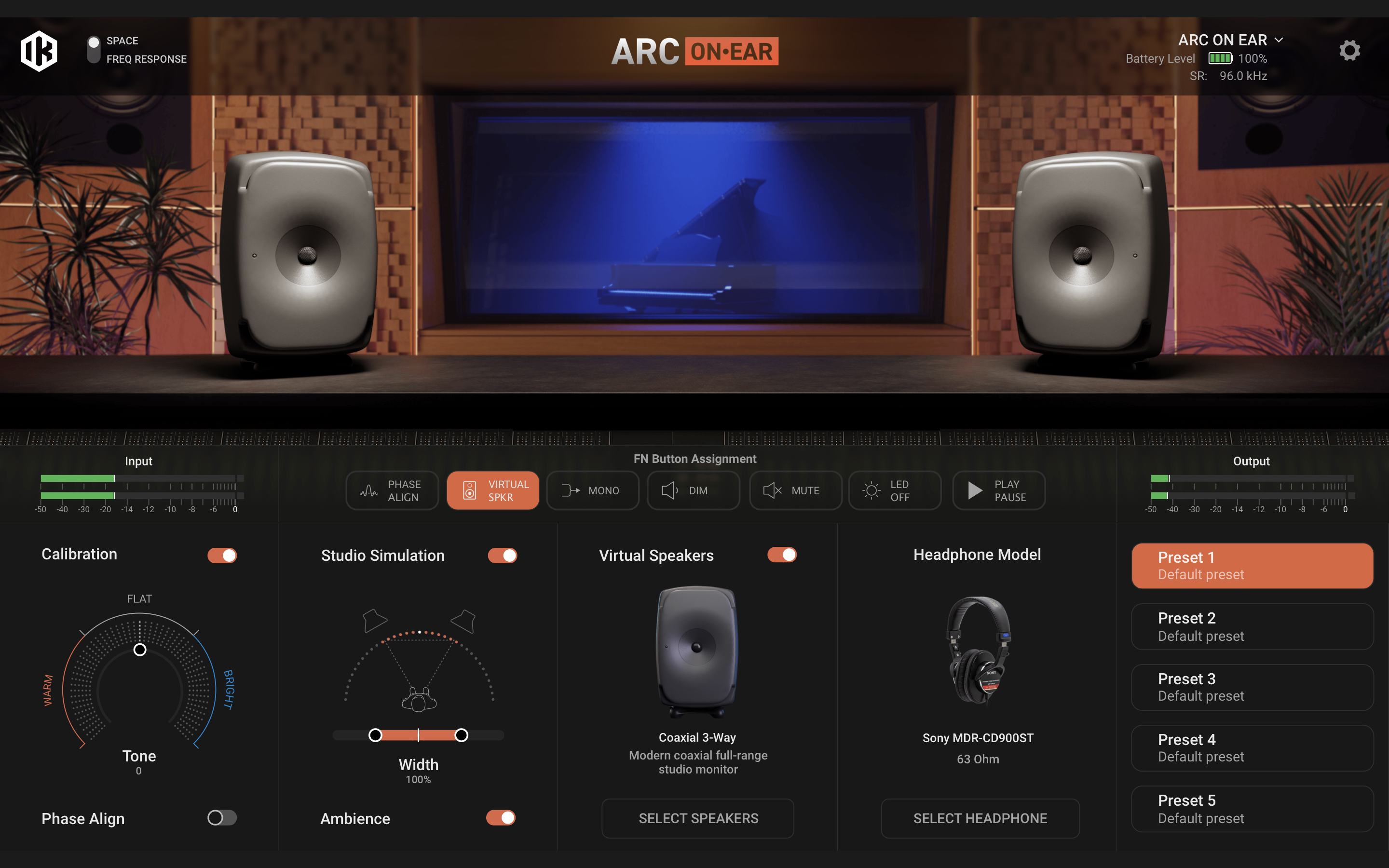ARC ON•EAR のバーチャル・モニタリングは、従来のプラグインやインパルス応答ベースの「バーチャル・ルーム」とは異なり、高度な物理モデリングによって、理想的な音響空間にある実際のスタジオ・モニターの挙動を再現します。人工的なリバーブや音色の色付けは一切ありません。本物のコントロール・ルームが持つ奥行き、広がり、そして明瞭さを、ヘッドフォンで体験できます。