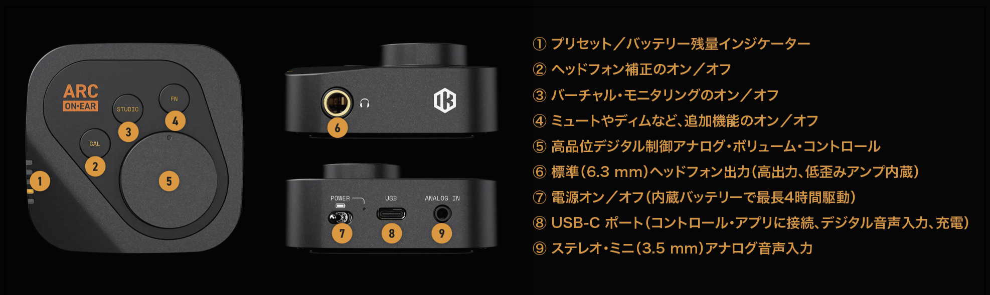 ARC ON•EAR は、ヘッドフォンの特性を瞬時に補正し、まるでプロフェッショナルなスタジオ・モニターでミックスしているかのような空間をも再現する、スタンドアローン型ヘッドフォン DAC & アンプです。どこにいても、確信を持ったヘッドフォン・ミックスが行える環境を提供します。