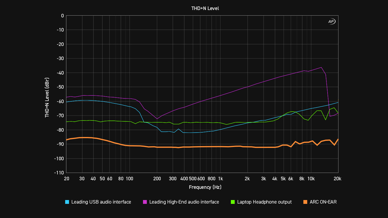 ARC ON•EAR のアンプは、主要なハイエンド・インターフェイスやノート PC と比較して、可聴帯域全体において最も低い歪み率を実現しています。限界まで追い込まれると、一般的なヘッドフォンアンプはその弱点を露呈します。ここに示されたグラフは、低インピーダンス(32 Ω)のヘッドフォンで高音量時に測定された、主要なオーディオインターフェイスおよびハイエンドノートパソコンのヘッドフォン出力と ARC ON•EAR の全高調波歪みを比較したものです。高電流アンプを搭載しているおかげで、ARC ON•EAR はオーディオ全帯域にわたって非常に低く安定した歪みを維持し、ほとんどのオーディオインターフェイスやノートパソコンに搭載されている標準的なヘッドフォン出力を明確に上回る性能を発揮します。