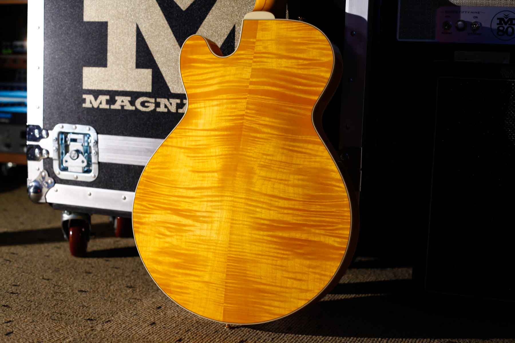 一般的なセミアコースティックはボディトップ、センターブロックにメイプル材を使用することが多いなか、GBNY-1ではトップにスプルース、センターブロックもメイプルではなくオールスプルース構造を採用。これによりフルアコ・ライクなトップ鳴りやニュアンスを加え、心地よい甘さと奥行き、埋もれない芯のあるトーンを両立させました。またバック&サイドに美しいフレイムメイプル材を採用。