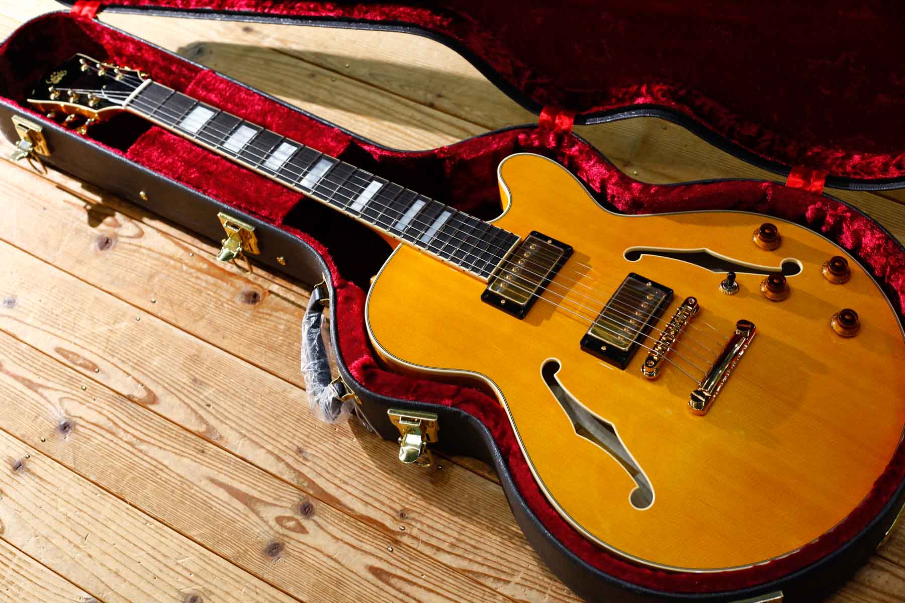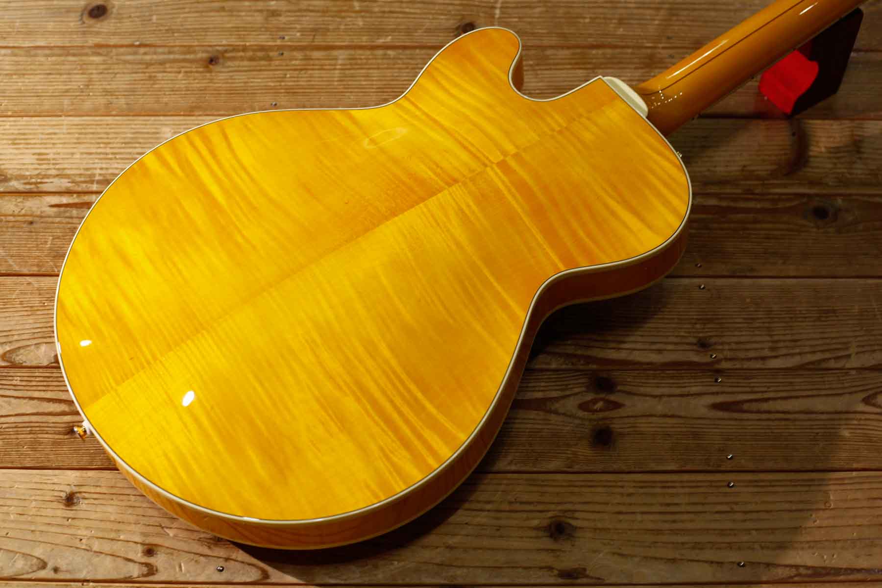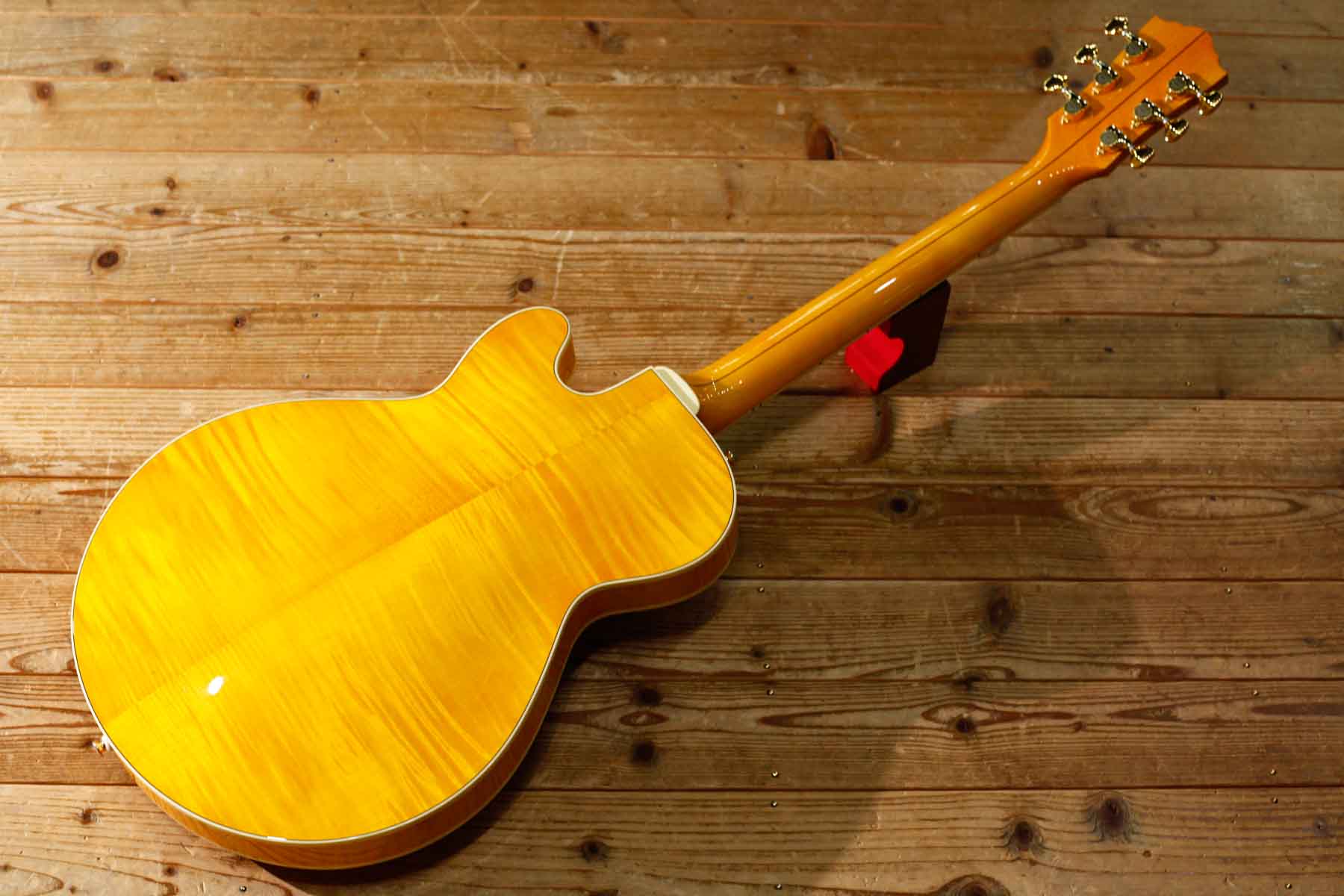 ナチュラルなカラーながらサイド&バックの美しいフレイムメイプル、ゴールドパーツ、黒々としたエボニー指板、ブロックインレイなど優雅で上品、どこか都会的なルックスに仕上がっております。ハイポジションでの速いパッセージにもしっかりとついてくるレスポンスの良さ、そしてメロウでありながら存在感のあるトーン。是非お試しください。