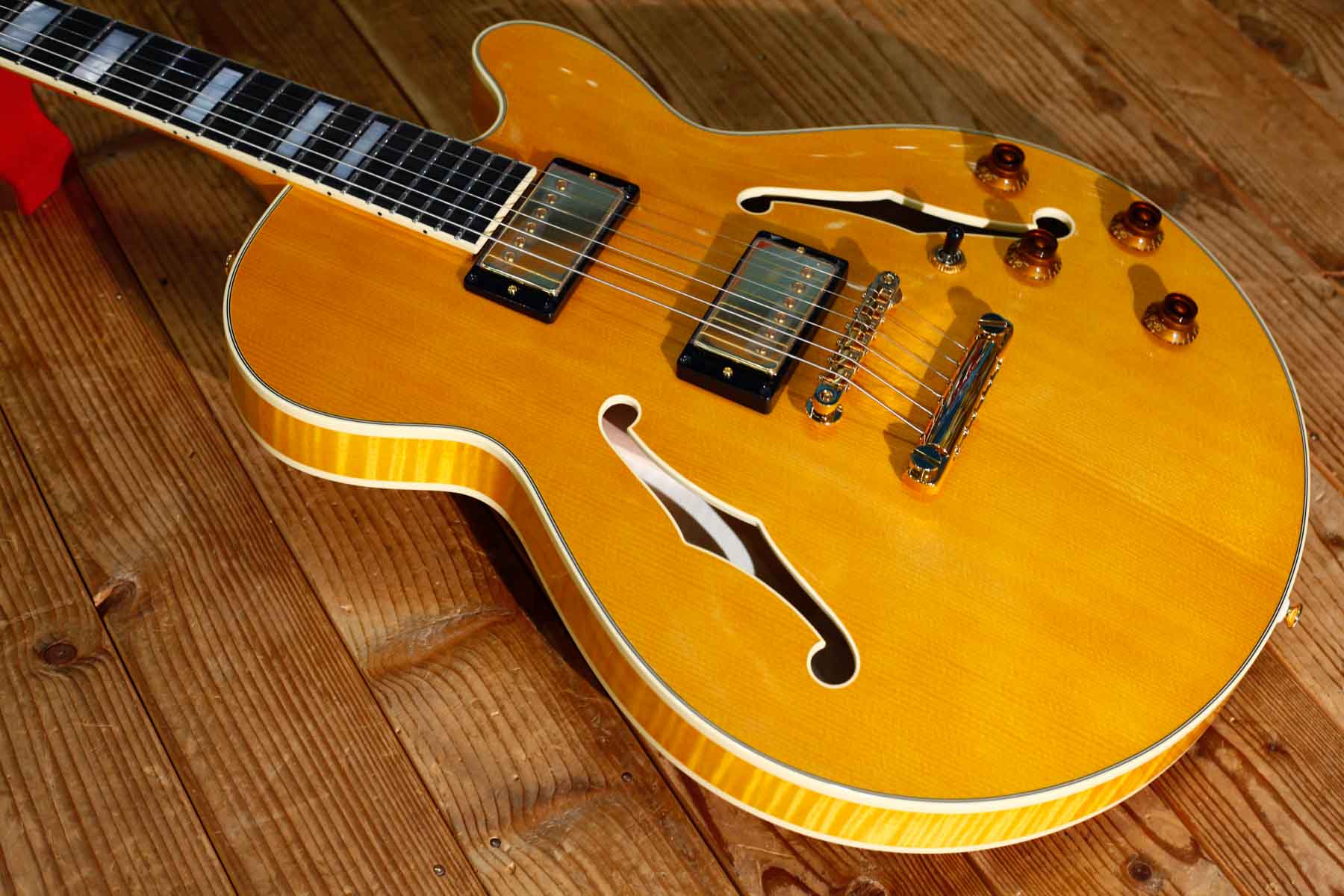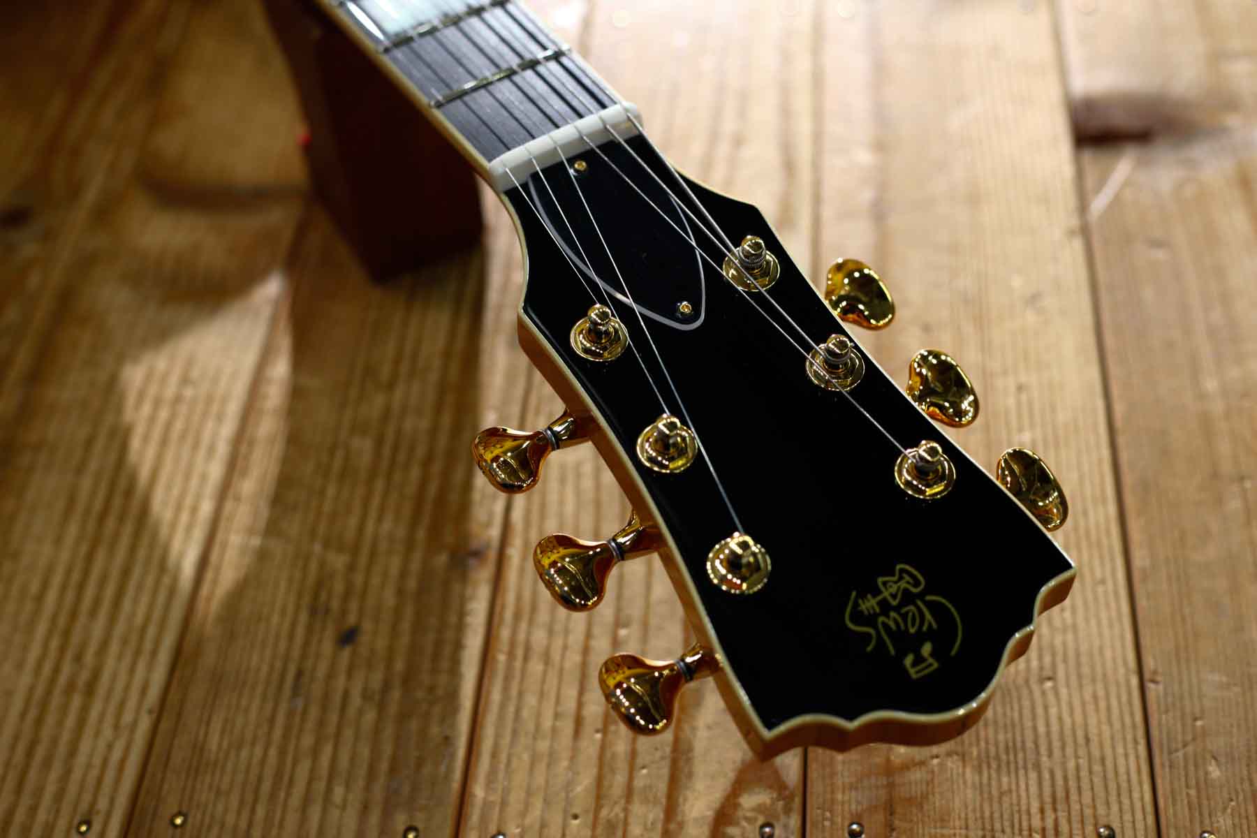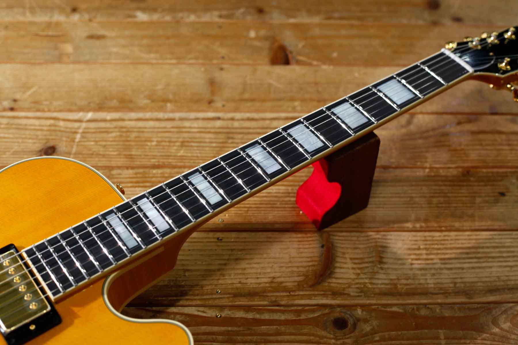ナチュラルなカラーながらサイド&バックの美しいフレイムメイプル、ゴールドパーツ、黒々としたエボニー指板、ブロックインレイなど優雅で上品、どこか都会的なルックスに仕上がっております。ハイポジションでの速いパッセージにもしっかりとついてくるレスポンスの良さ、そしてメロウでありながら存在感のあるトーン。是非お試しください。