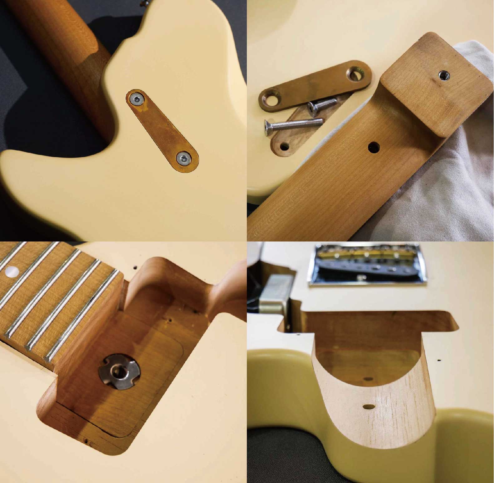 この独自の革新的なネックジョイント方式については下記の画像をご覧ください。フロントピックアップの真下まで伸びたフラットなジョイント面とネックシェイプがすっぽりハマるように整形されたネックポケットが特徴的です。ジョイントプレートの素材には真鍮を採用しており(埋め込み式)、豊かなレスポンスと鳴り感が約束されていることがわかると思います。
