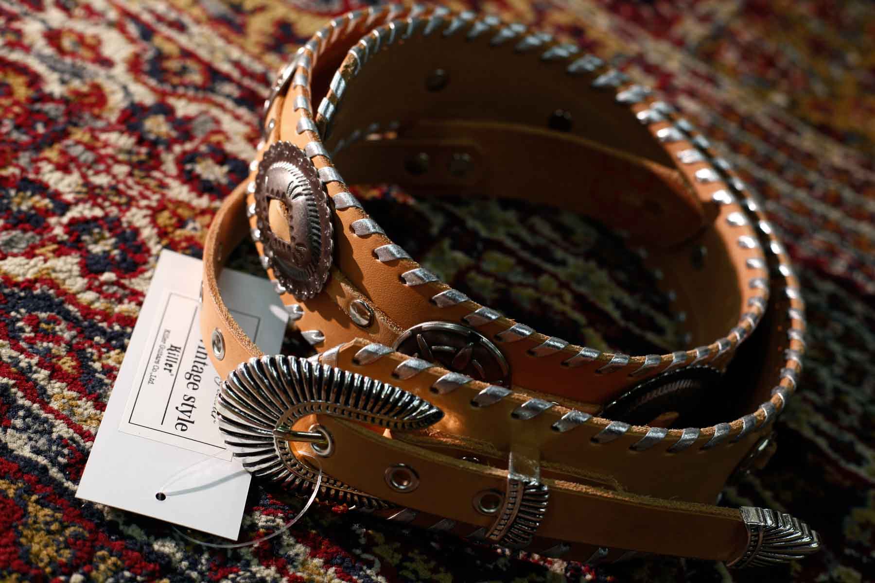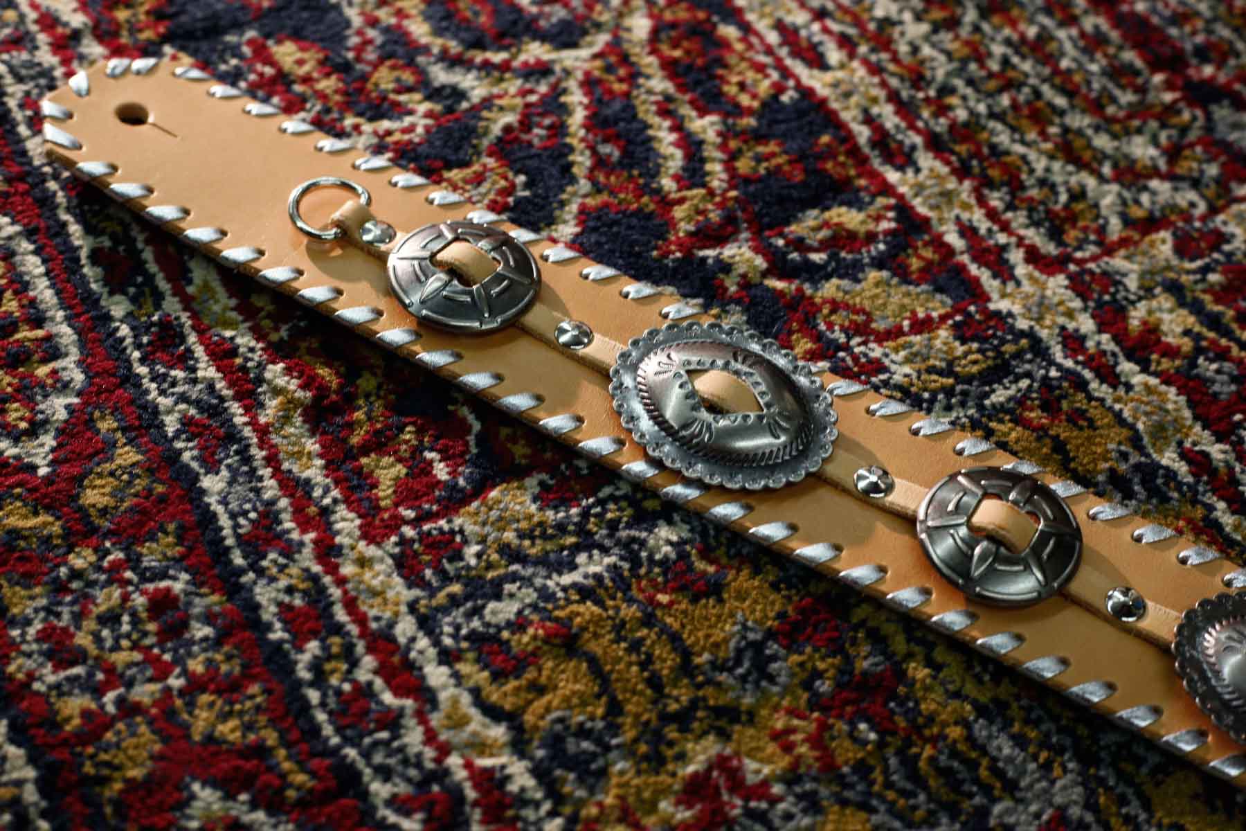 この「DD Vintage Style」は、幅50ミリのギター|ベース用ストラップです。カラーはブラウンです。大小コンチョを交互に計11個装備しています。縁はシルバーのレース・エッジ仕様です。